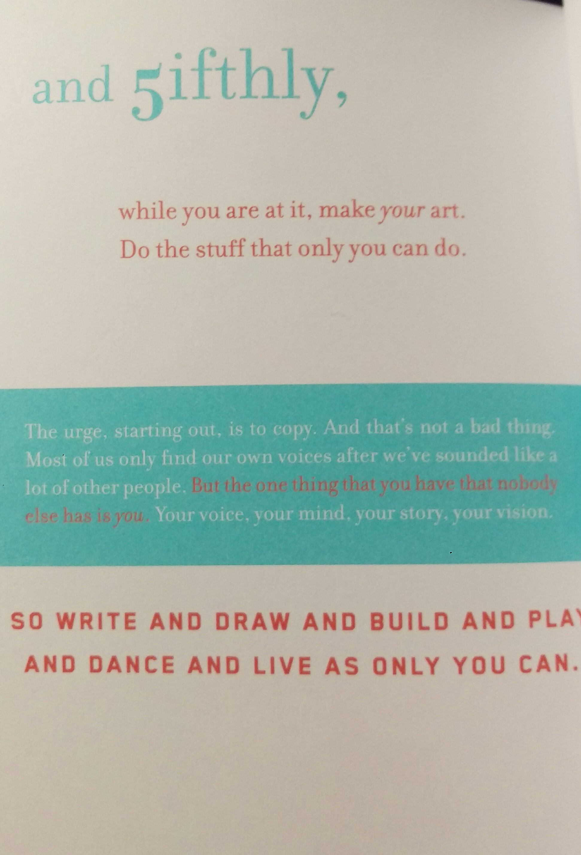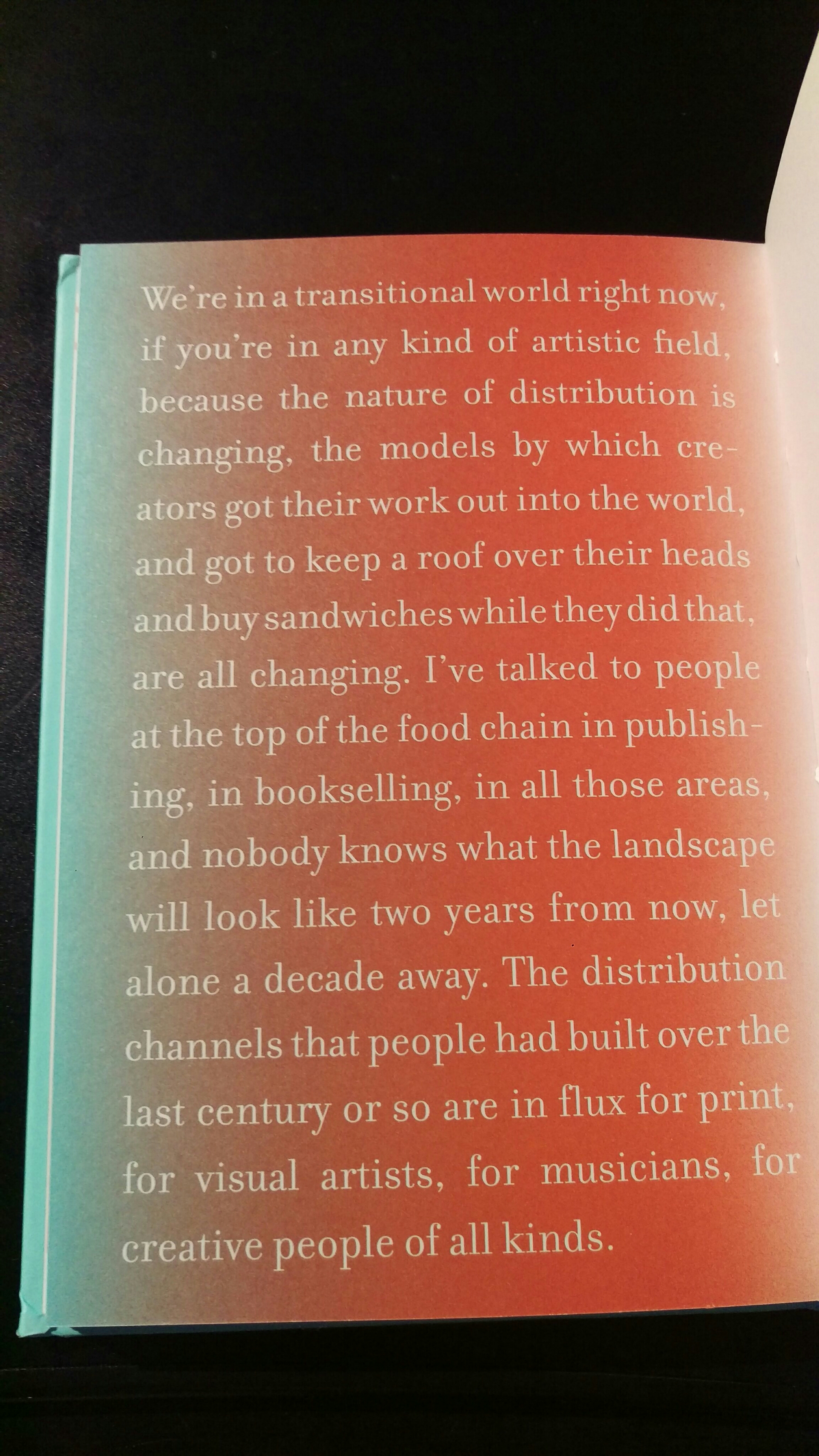 Je pense sincèrement que l’on devrait distribuer ce livre. L’offrir à tous ces jeunes gens dans les universités qui s’apprêtent à se lancer dans la vie active avec tant de rêves qu’ils abandonneront en chemin, par dépit. Pour être raisonnable.