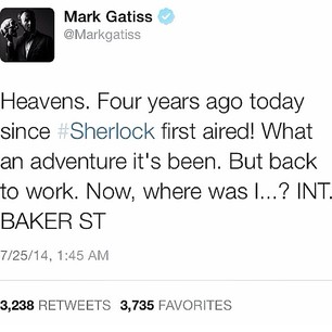 Plus qu’un showrunner, cet homme est un teaser à lui-seul. Il sait comme personne, établir une complicité avec les fans et surtout jouer de leurs attentes. En témoigne ce tweet pour les quatre ans de diffusion de Sherlock.